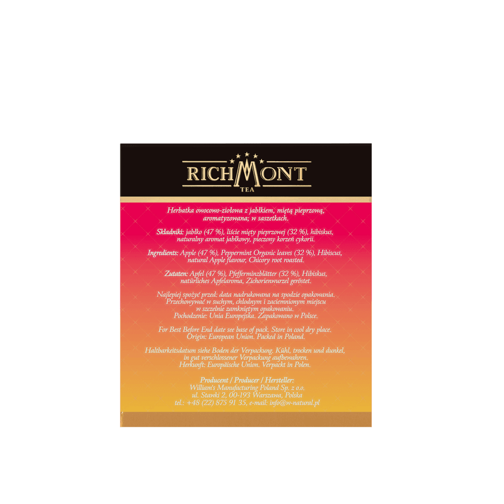 Herbatka owocowo-ziołowa z jabłkiem, miętą pieprzową, aromatyzowana; w saszetkach.
