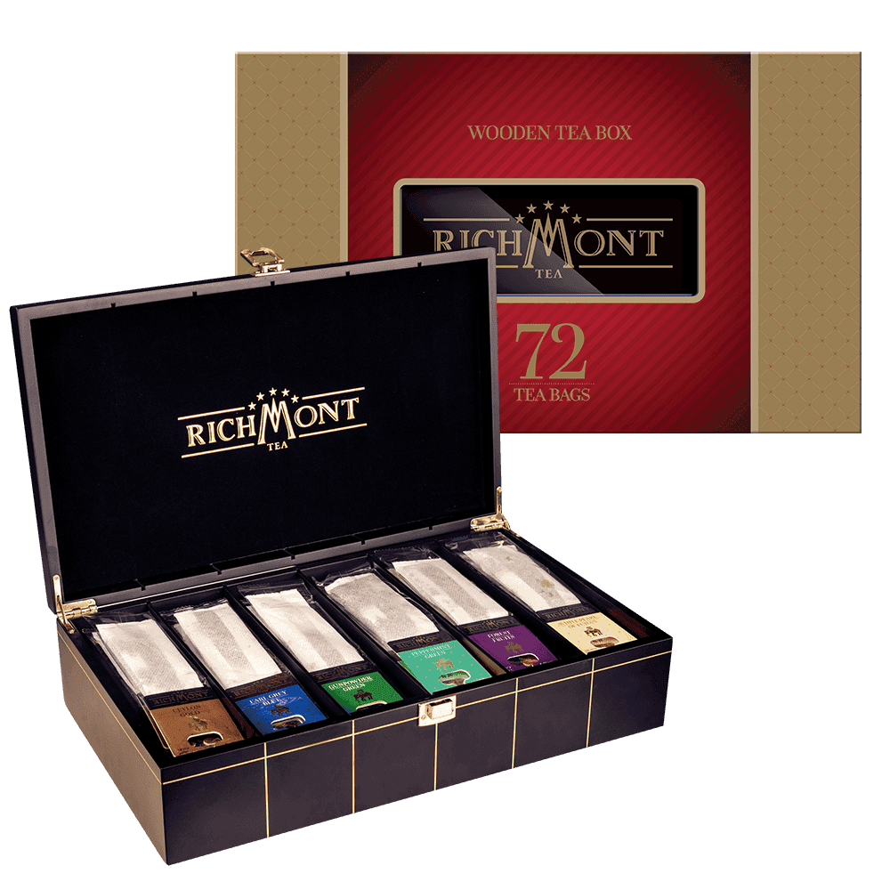 Drewniana skrzynka do prezentacji herbaty w eleganckiej restauracji, kawiarni lub biurze. W kolekcji jest sześć różnych smaków herbaty Richmont Excelence. Wykonana z naturalnego drewna skrzynka pozwala na prezentację herbaty przez obsługę. Nadaje się również na wytworny prezent lub jako wyposażenie eleganckiego biura bądź gabinetu.